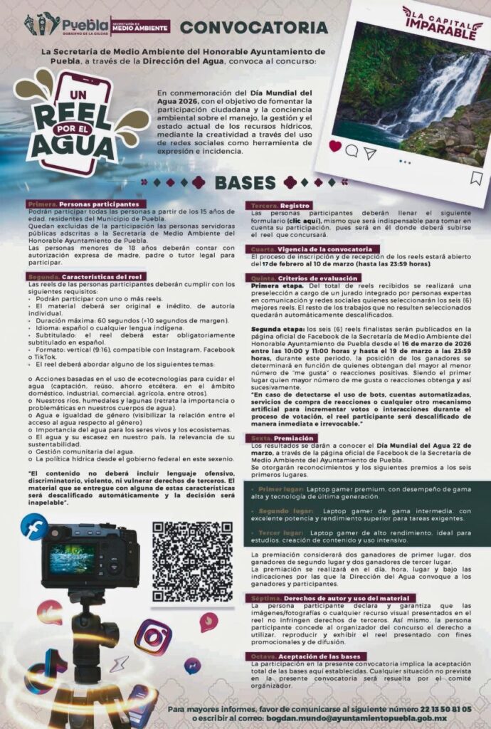 Puebla, Pue., a 24 de febrero de 2026.- El Gobierno de la Ciudad, que encabeza el alcalde Pepe Chedraui, convoca a la ciudadanía a participar en el concurso “Un Reel por el Agua”, iniciativa orientada a fortalecer la participación social y la conciencia ambiental en torno al manejo, la gestión y la situación actual de los recursos hídricos.
